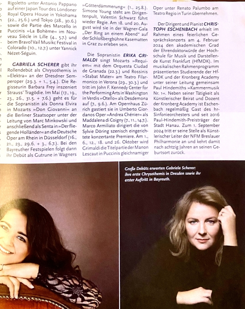 In their March 2024 issue, the German magazine Das Opernglas published a feature about Gabriela Scherer’s upcoming engagements: